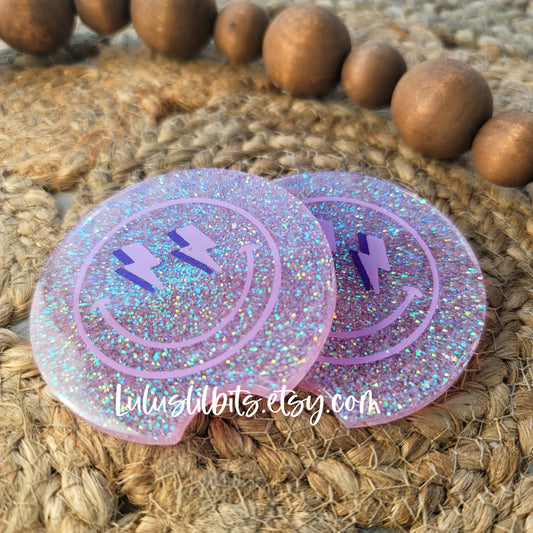 Retro Purple Glitter Smiley Face Coaster - Ready To Ship - Set of 2
